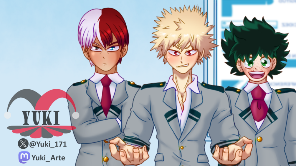 Deku, Shoto y Bakugo, tres de los chicos más guapos de BNHA, de cuerpo completo y luciendo sus uniformes.