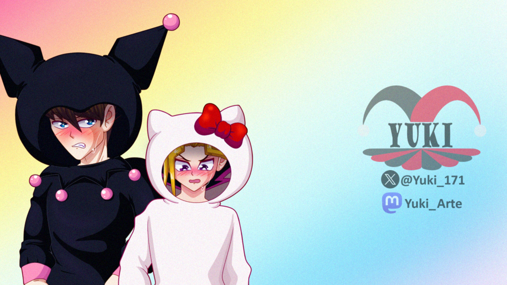 ✨🐰🐱 ¿Quién dijo que los duelistas no saben ser tiernos? Kaiba en kigurumi de Kuromi y Yami en Hello Kitty 💖, listos para derretir corazones con sonrisas apenadas.